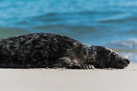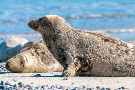 Grey seals, Halichoerus grypus, lying down on a beach of Dune island in Northern sea, Germany. Funny animals on a beautiful sunny day of winter. Wildlife of the north.