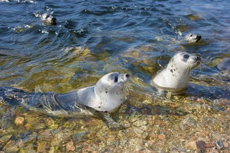 The Ladoga ringed seals resting on a stone. Scientific name: Pusa hispida ladogensis. The Ladoga seal in a natural habitat. Ladoga Lake. Russia
