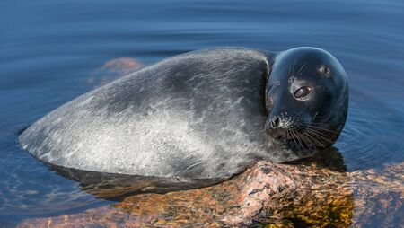The Ladoga ringed seal. Close up portrait. Scientific name: Pusa hispida ladogensis. The Ladoga seal in a natural habitat. Ladoga Lake. Russia