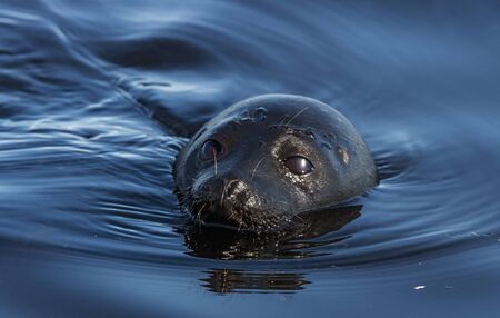 The Ladoga ringed seal swimming in the water. front view. blue water background. Scientific name: Pusa hispida ladogensis. The Ladoga seal in a natural habitat. summer season. Ladoga Lake. Russia
