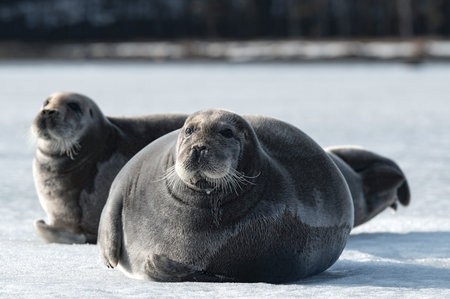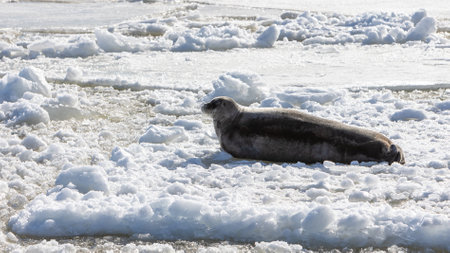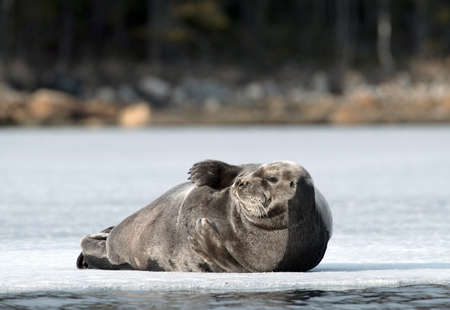 Seal resting on an ice float. close up. The bearded seal, also called the square flipper seal. Scientific name: Erignathus barbatus. White Sea, Russia