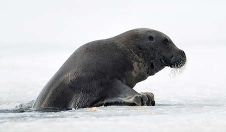 The Ladoga ringed seal. side view portrait. close up. Scientific name: Pusa hispida ladogensis. The Ladoga seal in a natural habitat. Ladoga Lake. Russia