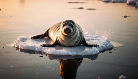 A seal lounges peacefully on a floating piece of ice, surrounded by calm water reflecting the golden hues of a setting sun. The scene captures the serene beauty of the Arctic.