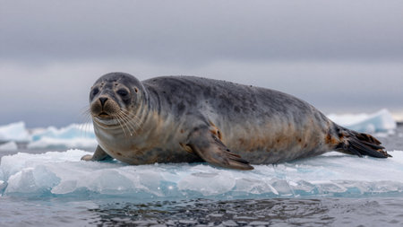 A charming scene capturing a group of playful seals lounging together on a frozen ice surface. Their curious expressions and soft fur create a serene atmosphere in a beautiful arctic landscape.