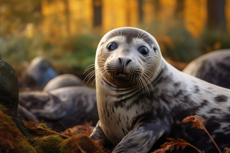 Adorable seal pup with long whiskers and large, dark eyes looks curiously at the camera, river and autumn leaves in the background.