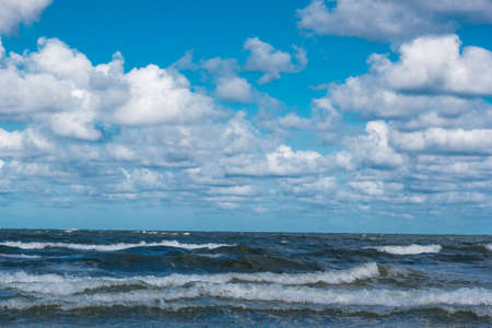 Wavy water of the Baltic sea and cloudy sky in the warm evening sunlight