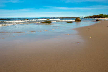 sunny beach with blue water and large rocks in the sand. Latvia under clear sky