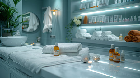 Relaxing woman enjoys spa treatment with towels and serene decor in a coastal setting. Generative AI