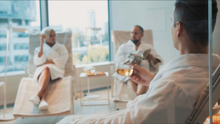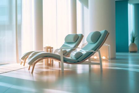 A luxurious spa relaxation room featuring modern design elements with a blend of textured walls, ambient lighting, and ergonomic lounge chairs.