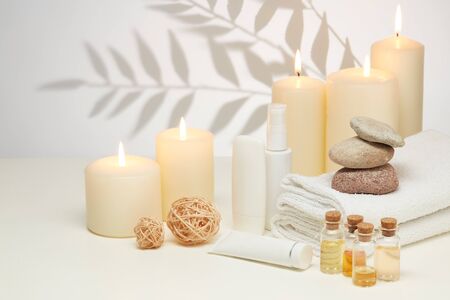 Spa composition with burning candles on a soft light background. Top view with copy space. The concept of body care.