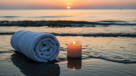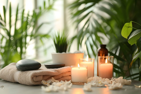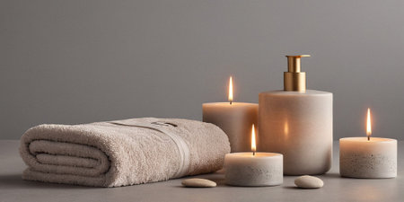 A serene spa arrangement featuring soft towels, glowing candles, and smooth stones invites relaxation and tranquility in a soothing environment. Perfect for wellness themes.
