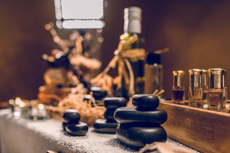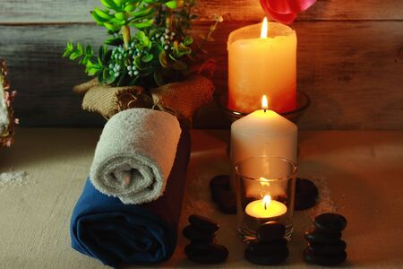 Spa-still life on a brown wooden background with a towel massage stones and aromatic oil and a burning candle.