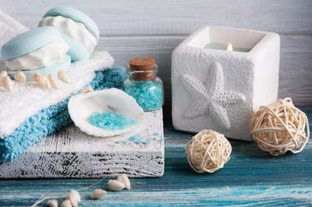 white clean cotton spa towel cloths prepared for day spa service on blue wooden table with massage oil bottle, essential oil, candle, and oil burner with background of vintage wooden wall in nice spa