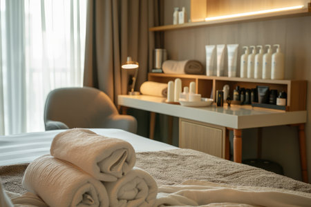Relaxing spa setup with rolled towels, essential oils, and stones in a tranquil environment during a calm afternoon