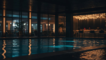 Swimming pool in luxury hotel at night with bokeh lights