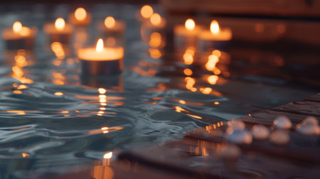 A defocused background image of a wooden spa pool creating a cozy and intimate setting. Soft candlelight and a hint of bubbles add to the soothing and indulgent atmosphere perfect