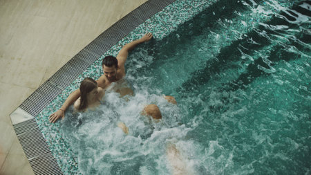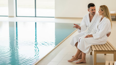 Young caucasian couple relaxing by indoor pool in spa robes