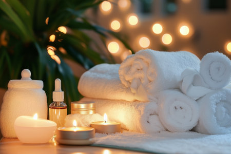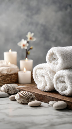 This tranquil spa setting features rolled towels and flickering candles, creating a serene ambiance perfect for relaxation and self-care treatments.