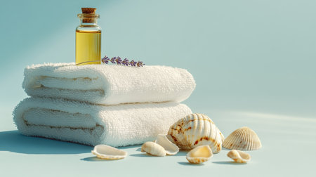A tranquil spa setup featuring an essential oil bottle, a soft towel, and smooth stones arranged elegantly to promote relaxation and wellness at home. Perfect for personal care.