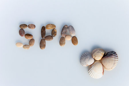 natural beauty products conceptual still-life, lotions and essential oil bottles surrounded by flowers and shells with Spa text