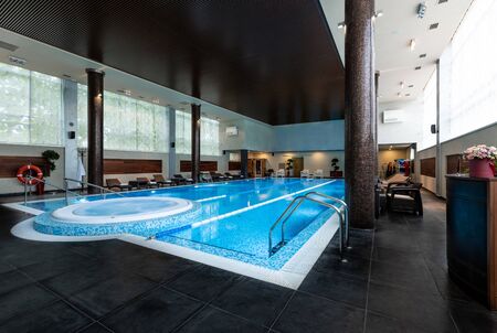 Relaxing spa interior with stacked towels and serene pool area