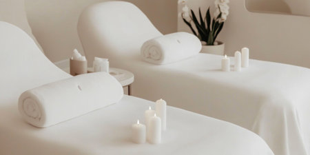 Spa concept with white massage beds, candles, and orchid, serene background, AI generated