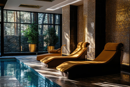 Lounge chairs sit beside a tranquil pool, illuminated by soft sunlight filtering through large windows.