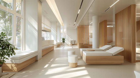 Bright and inviting polyclinic interior with comfortable seating and natural light filtering in