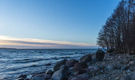 Stones on the shore of stormy waving Ladoga lake. Priozersk, Russia.