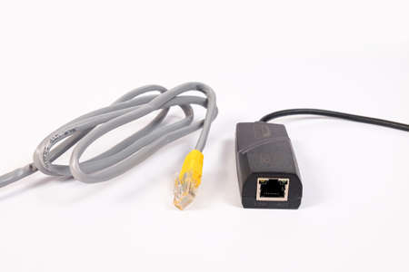 White internet connectors placed on grey surface, cable with plastic clip at tip