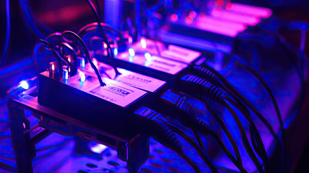 Close-up view of advanced electronic devices featuring vibrant LED lights, showcasing intricate wiring in a modern computer network configuration.