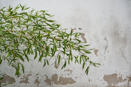 Bamboo Leaves with Wall. Green bamboo Bambusoideae leaves leaning against a peeling plaster wall. Contrast of fresh foliage with aged surface.