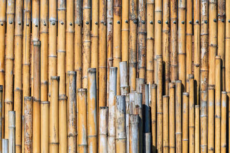 Bamboo background and backdrop battens are arranged to the wall partition and fence in the morning with sunlight.