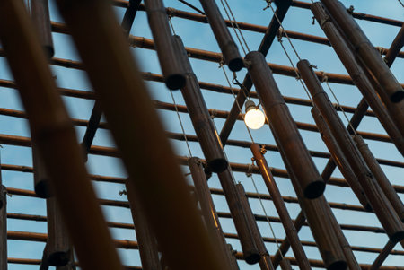 A captivating view of a bamboo ceiling structure with a hanging light fixture. This unique design combines natural materials and modern aesthetics, enhancing the ambiance.