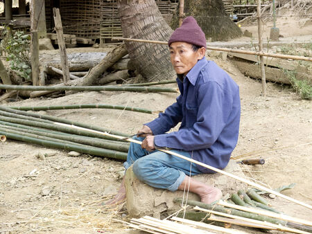 MUANG NGOI, LAOS - JANUARY 26 An old man cuts bamboo outside his home , on January 26, 2014, in Muang Ngoi, Laos