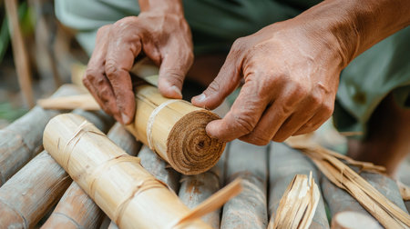 Close up of an artisan's hands meticulously weaving colorful bamboo strips, showcasing traditional craftsmanship