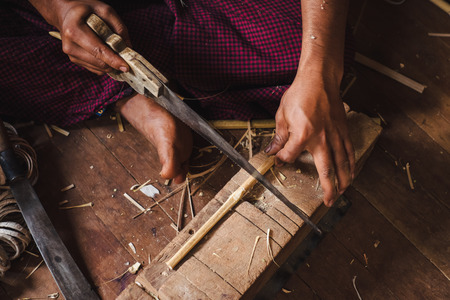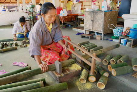 Chiang Mai, Thailand - November 11, 2008: Unidentified Thai woman cuts bamboo trunks at the traditional umbrella factory in Chiang Mai, Thailand.