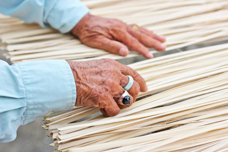 Close up of Asian old woman hands weaving bamboo mat in traditional way