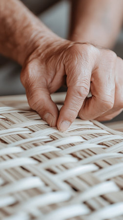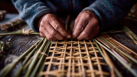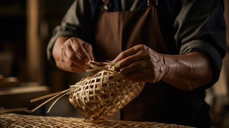 Craftsman's hands weave a basket, showcasing real textures and skilled craftsmanship essence