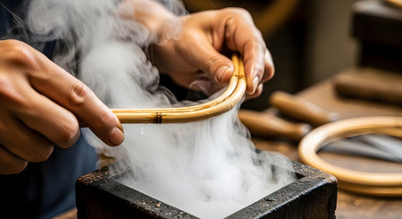A close-up of a craftsman's hands using a traditional steam-bending technique to shape a piece of bamboo. Plumes of hot steam rise from a wooden box as the artisan carefully bends the wood into a curve. This image captures the essence of traditional craftsmanship, handmade skill, and natural materials.