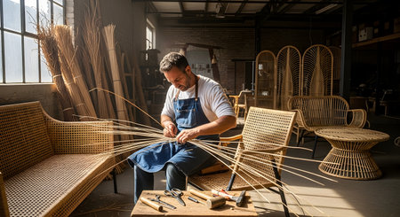 A focused craftsman, wearing a denim apron, sits in his workshop meticulously weaving a rattan chair by hand. The studio is filled with bundles of raw rattan and finished wicker furniture, showcasing traditional craft, skill, and small business.