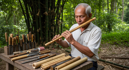 An elderly Asian man sits outdoors crafting and testing a traditional bamboo flute. Surrounded by tools and bamboo stalks in a forest setting, he embodies the preservation of cultural heritage and artisanal musical instrument making.