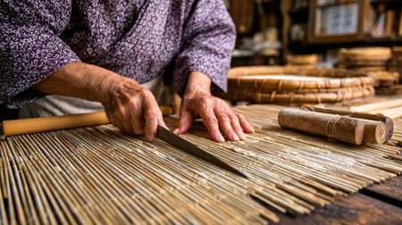 A skilled artisan demonstrates the intricate process of crafting traditional bamboo mats with precision and care in a rustic workshop environment.