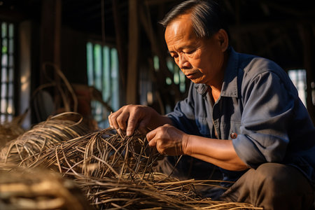 Craftsman weaving bamboo strips into traditional basket in workshop