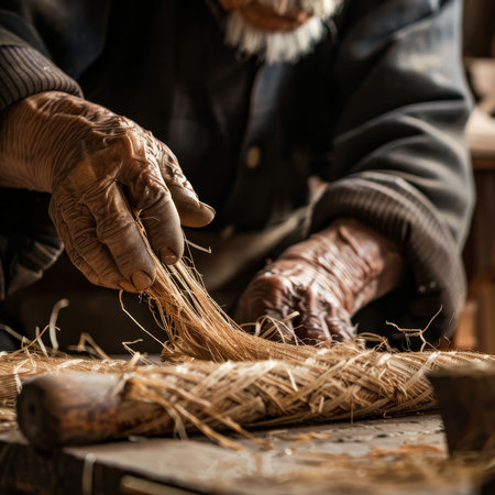 With weathered hands that hold generations of knowledge, an artisan carefully binds together stalks of straw.