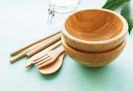 Natural eco-friendly food packaging disposable utensils with dish plate bowl cup and wooden fork spoon / Eco friendly disposable tableware from palm leaf or betel nut , zero waste environment concept