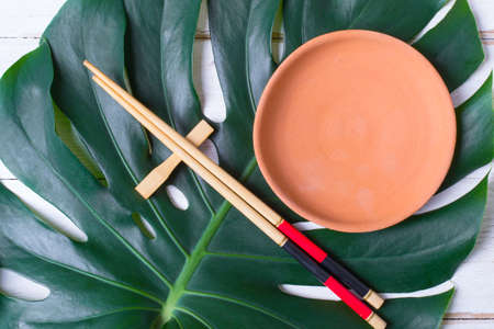 Empty plate on a yellow background. Empty plate for asian and chinese food and cuisine with chinese chopsticks