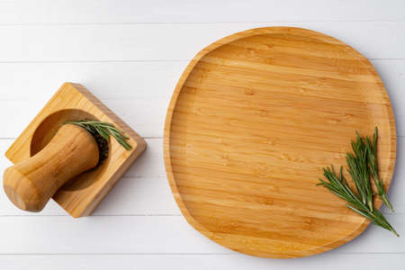 Rolls sticks and an empty plate of bamboo on a gray background with space for text