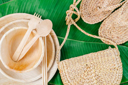 Kitchenware made from dried betel nut leaf palm, Flip flop and bag made from Water hyacinth or Floating water hyacinth, Natural material. The Green product eco friendly concept.