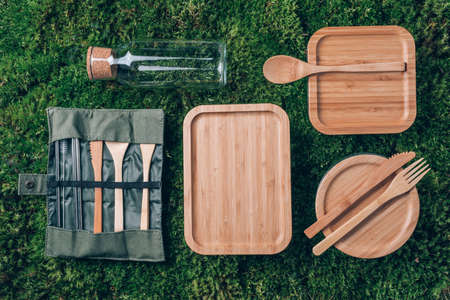 Glass jar, bottle, metal cup, straws for drinking, bamboo cutlery and lunch boxes on green grass, moss background. Top view. Sustainable lifestyle. Zero waste, plastic free shopping concept. Picnic
